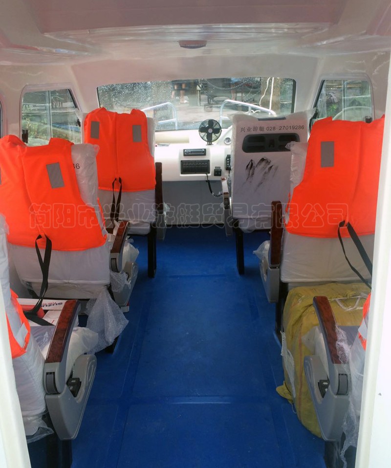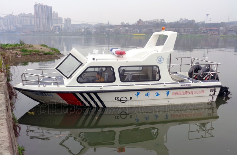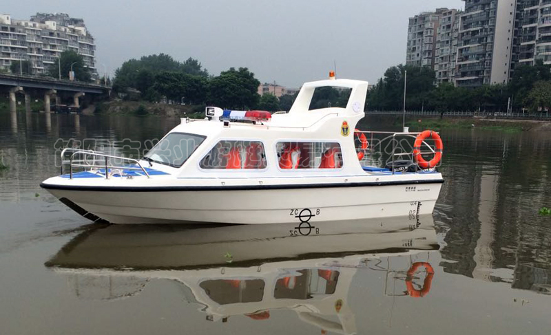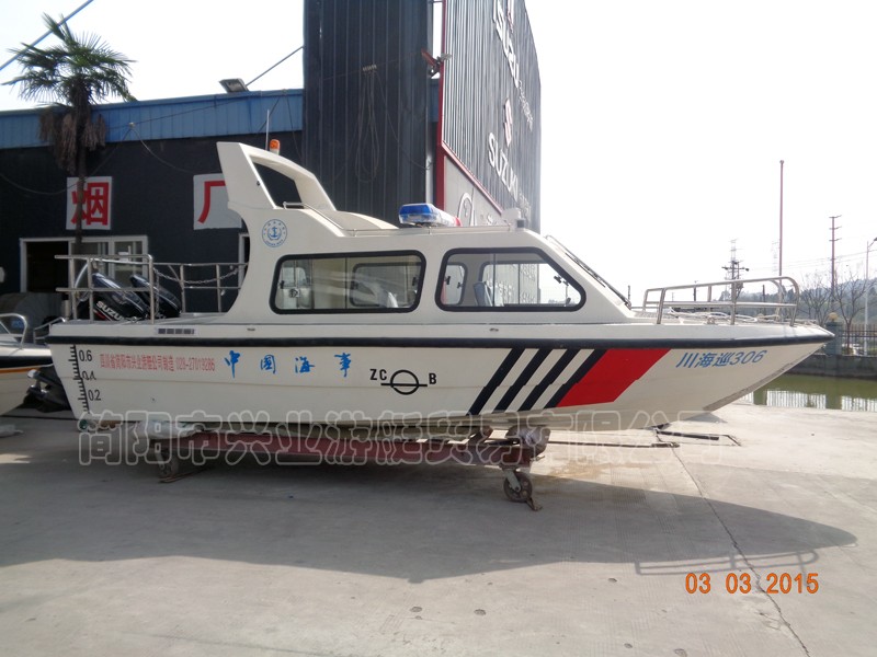 本艇為全玻璃鋼結(jié)構(gòu)高速艇,艇尾艉封板處安裝1-2臺(tái)舷外掛機(jī)或1臺(tái)舷內(nèi)外機(jī)作為推進(jìn)主機(jī),由駕駛臺(tái)方向盤(pán)通過(guò)液壓操縱裝置帶動(dòng)機(jī)器舷外艉機(jī)左右擺動(dòng),起到操舵作用;本艇限制于我國(guó)內(nèi)河B級(jí)航區(qū)航段航行。