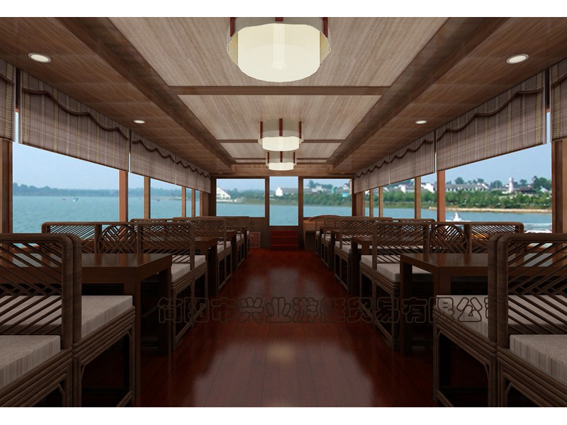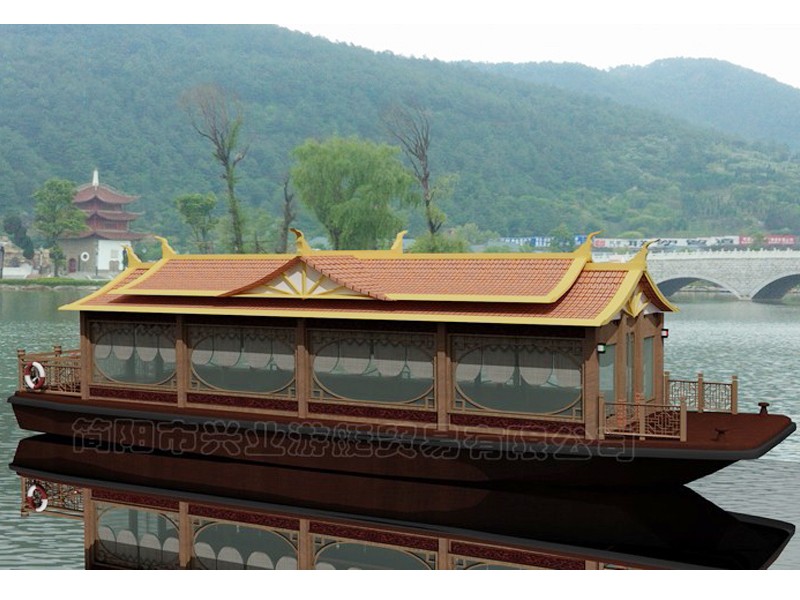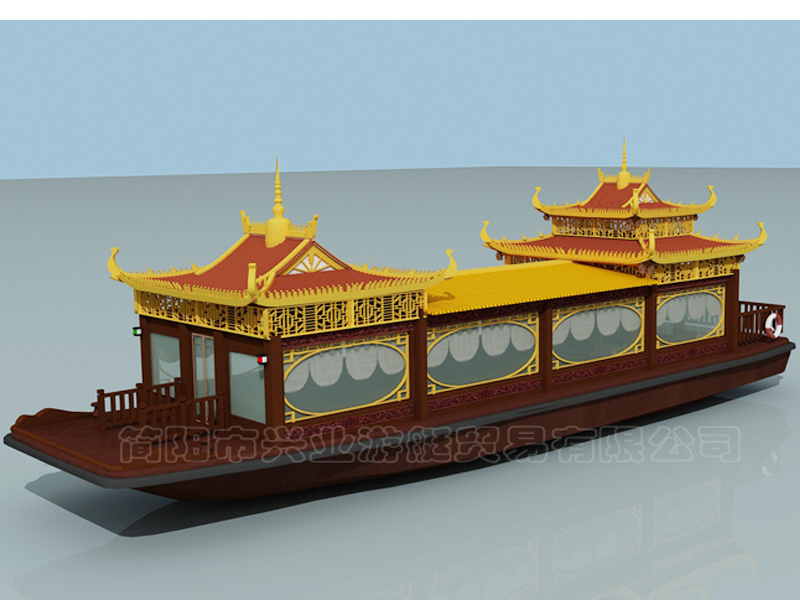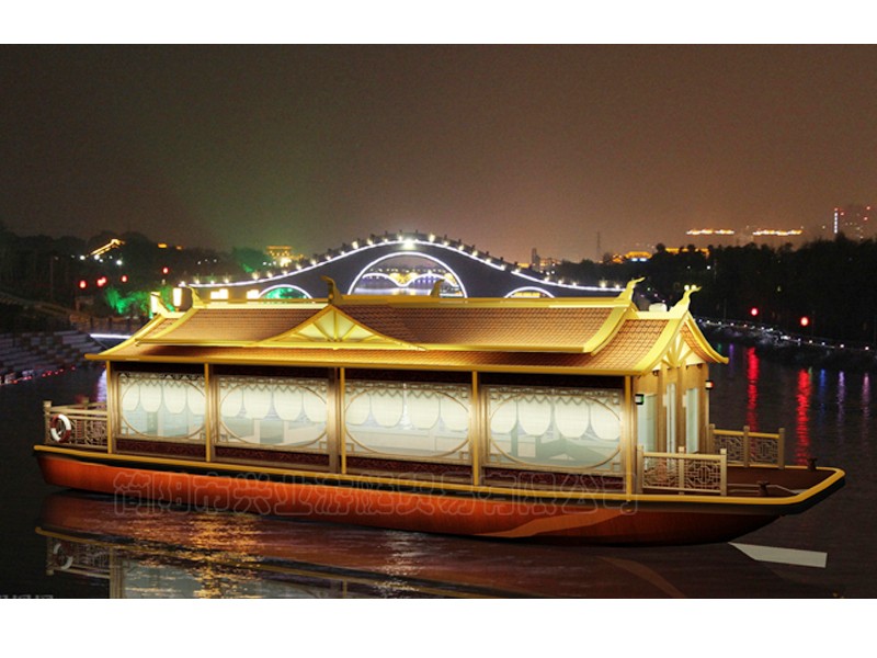 甲板及畫舫屋頂均采用玻璃鋼制造(主船體也可采用鋼質(zhì)),上層結(jié)構(gòu)采用木機(jī)構(gòu)畫舫造